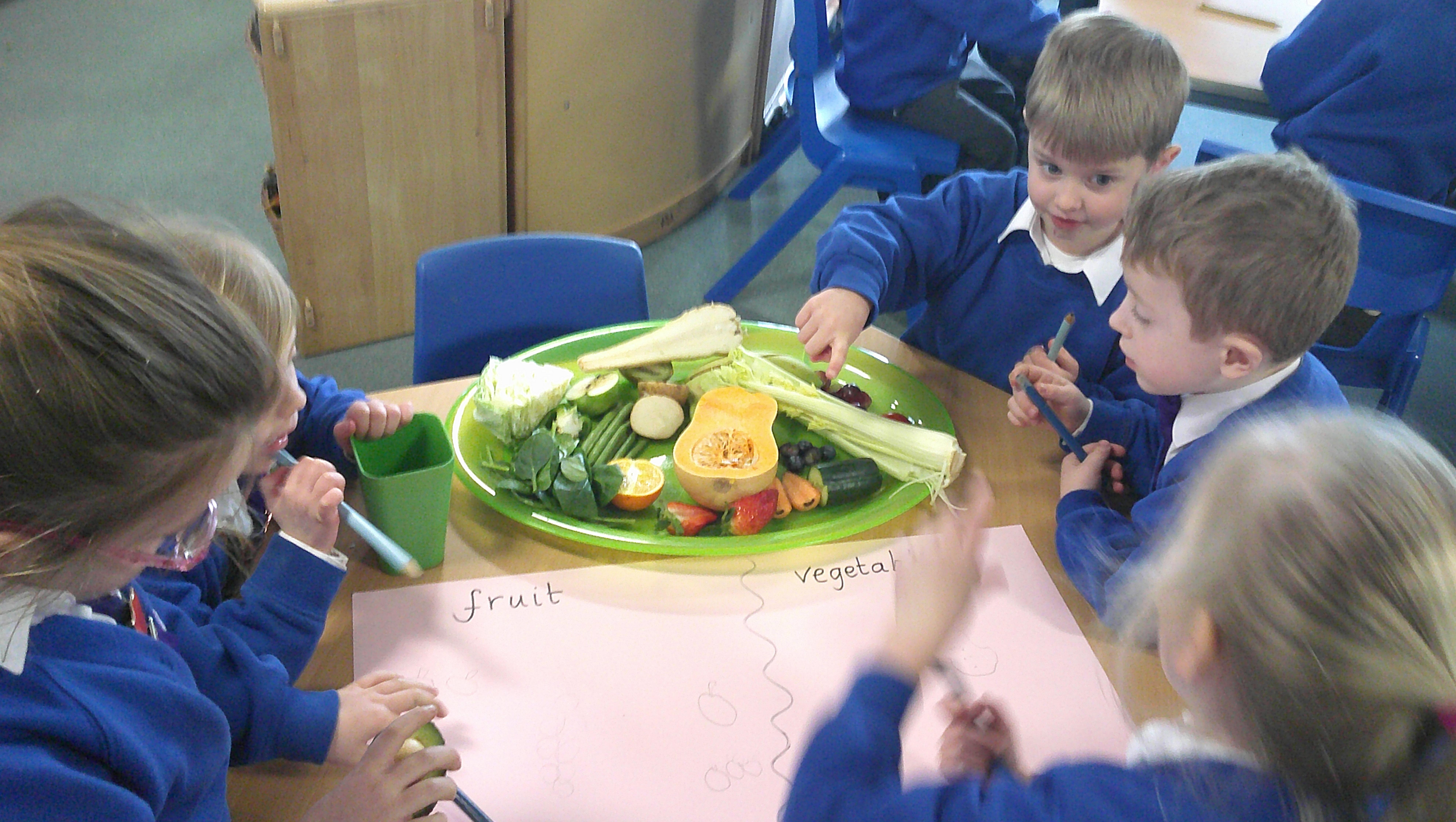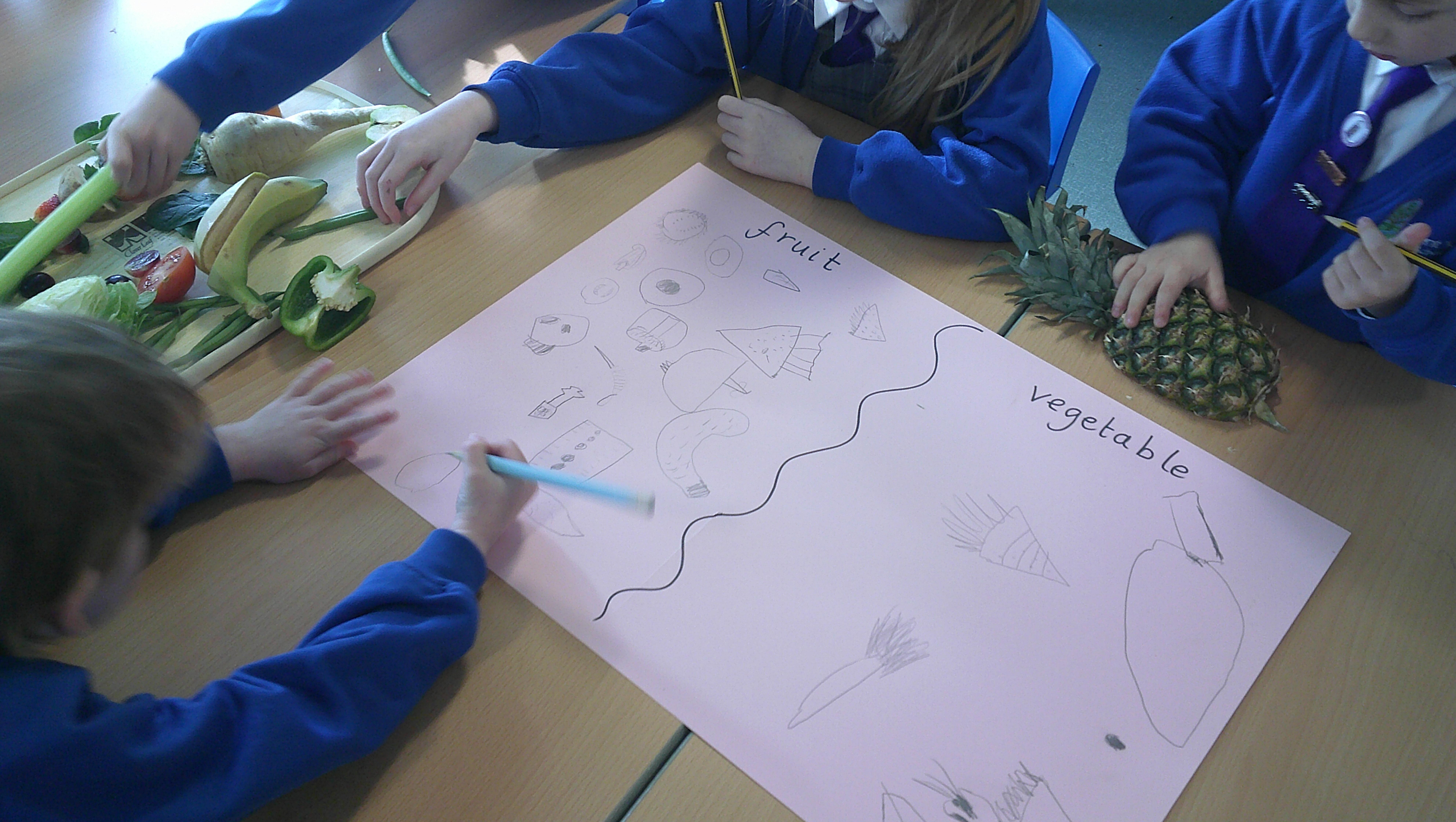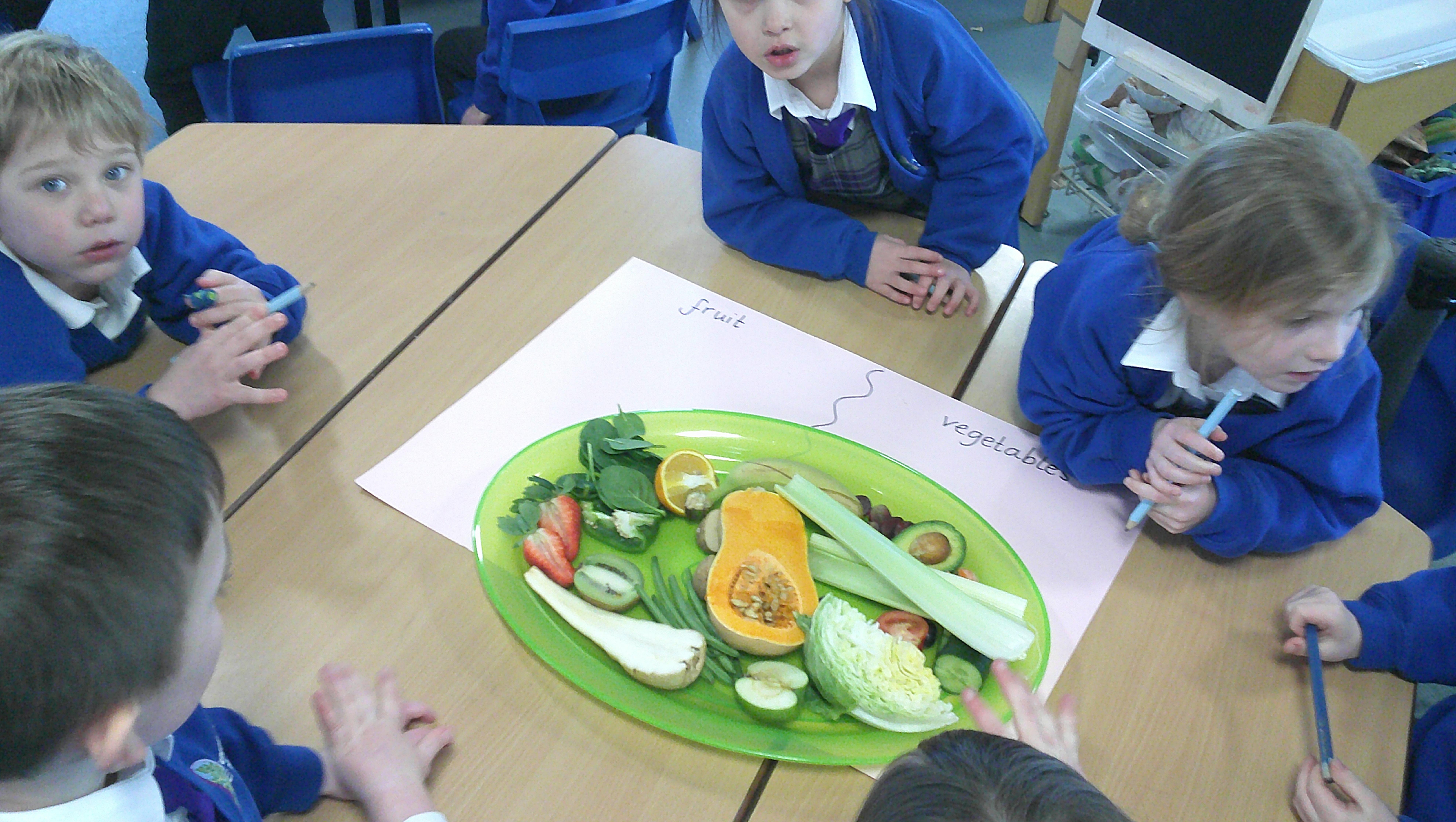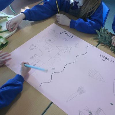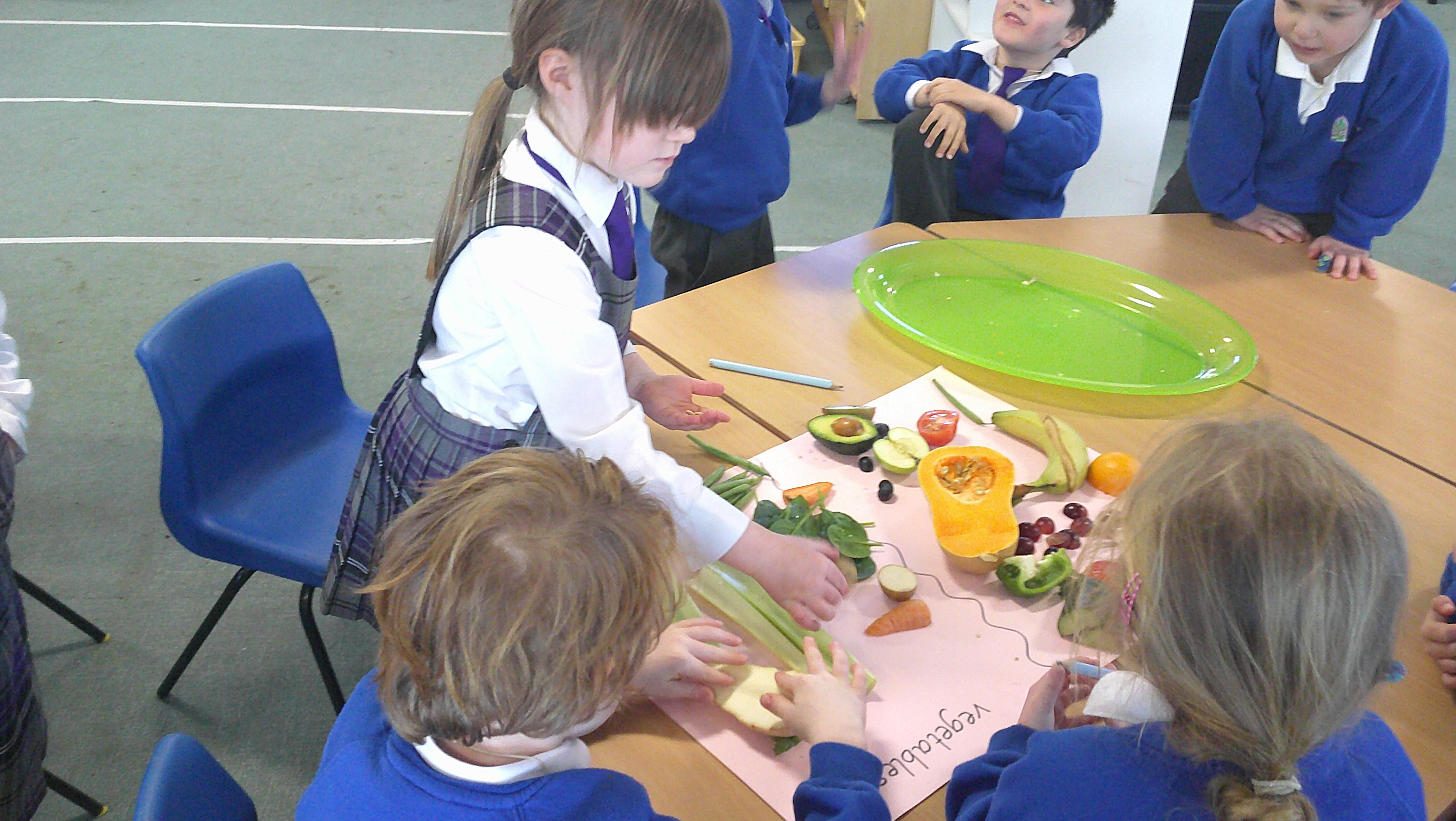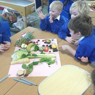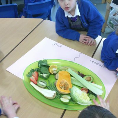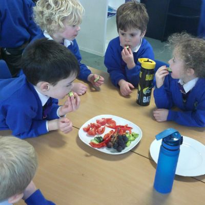 We started our DT food and nutrition unit by exploring fruit and vegetables. We started by naming and describing a wide range of fruit and vegetables. The children gave suggestions as to how we could sort the fruit and vegetables. We then used our knowledge that fruits contains the seed, so we had a careful look to see if we could see the seeds. We finished the session with a food tasting and tasted the fruits that often get mistaken for vegetables (peppers, avocado, cucumber and tomato).
