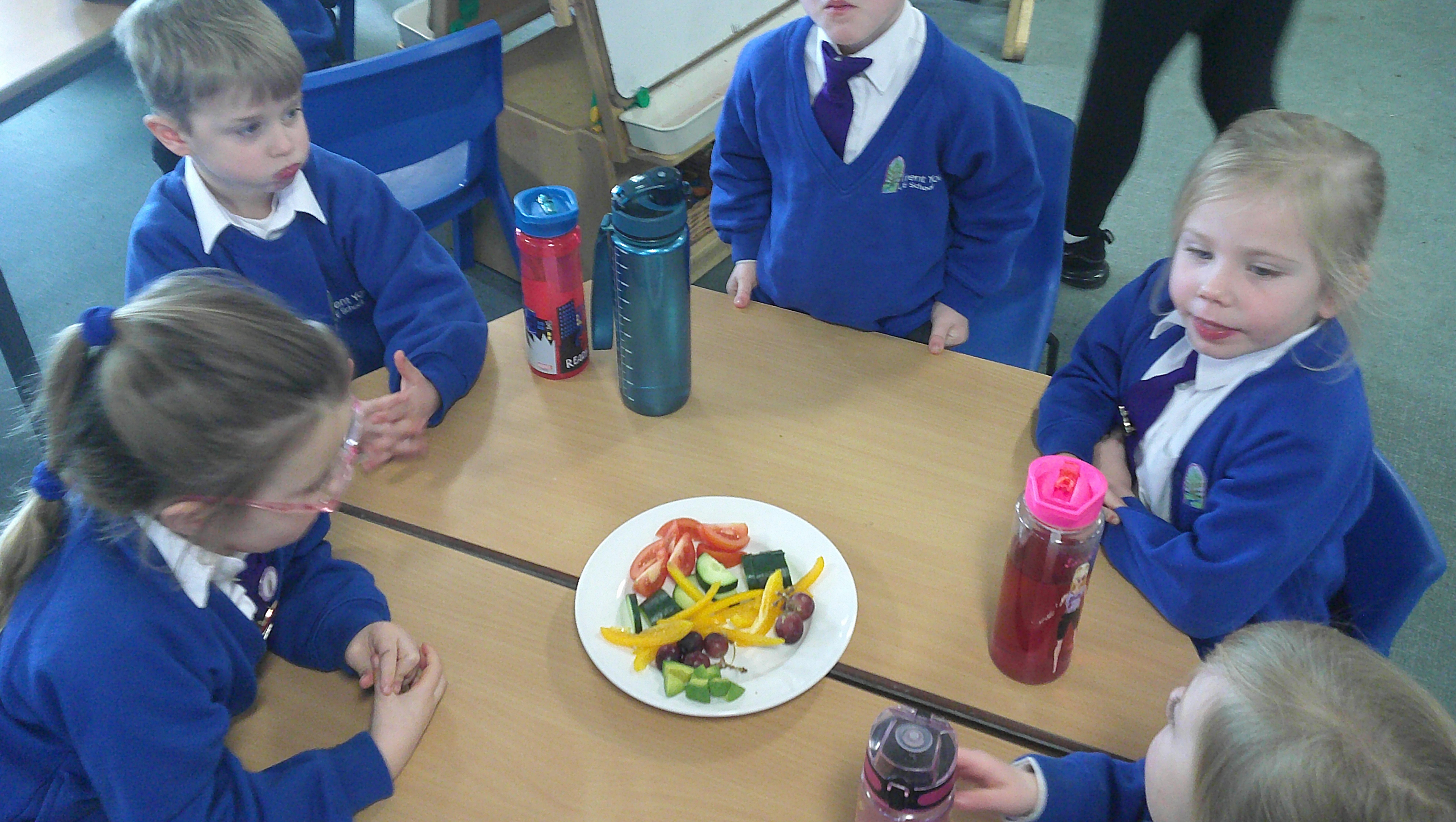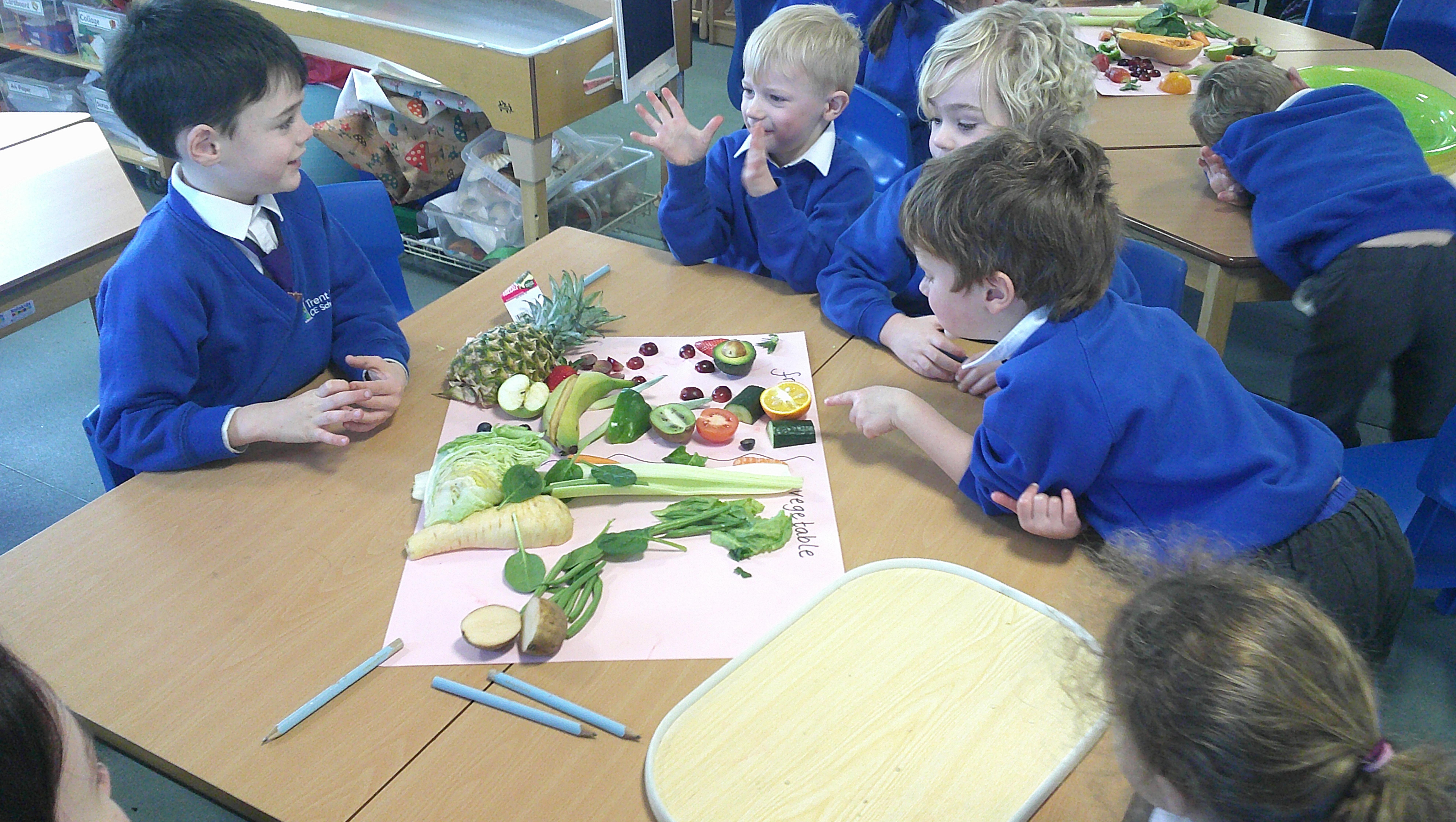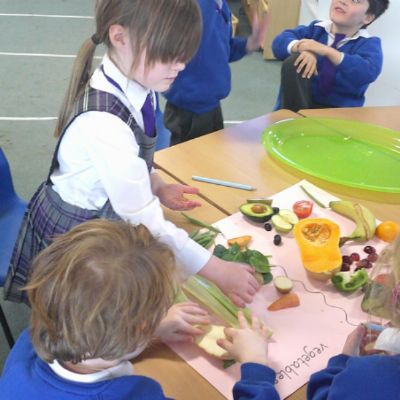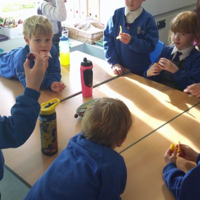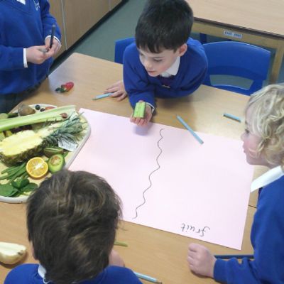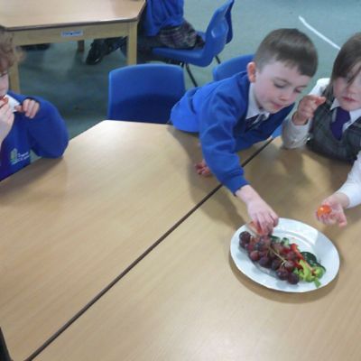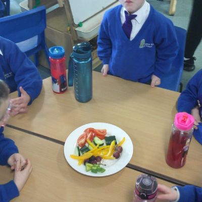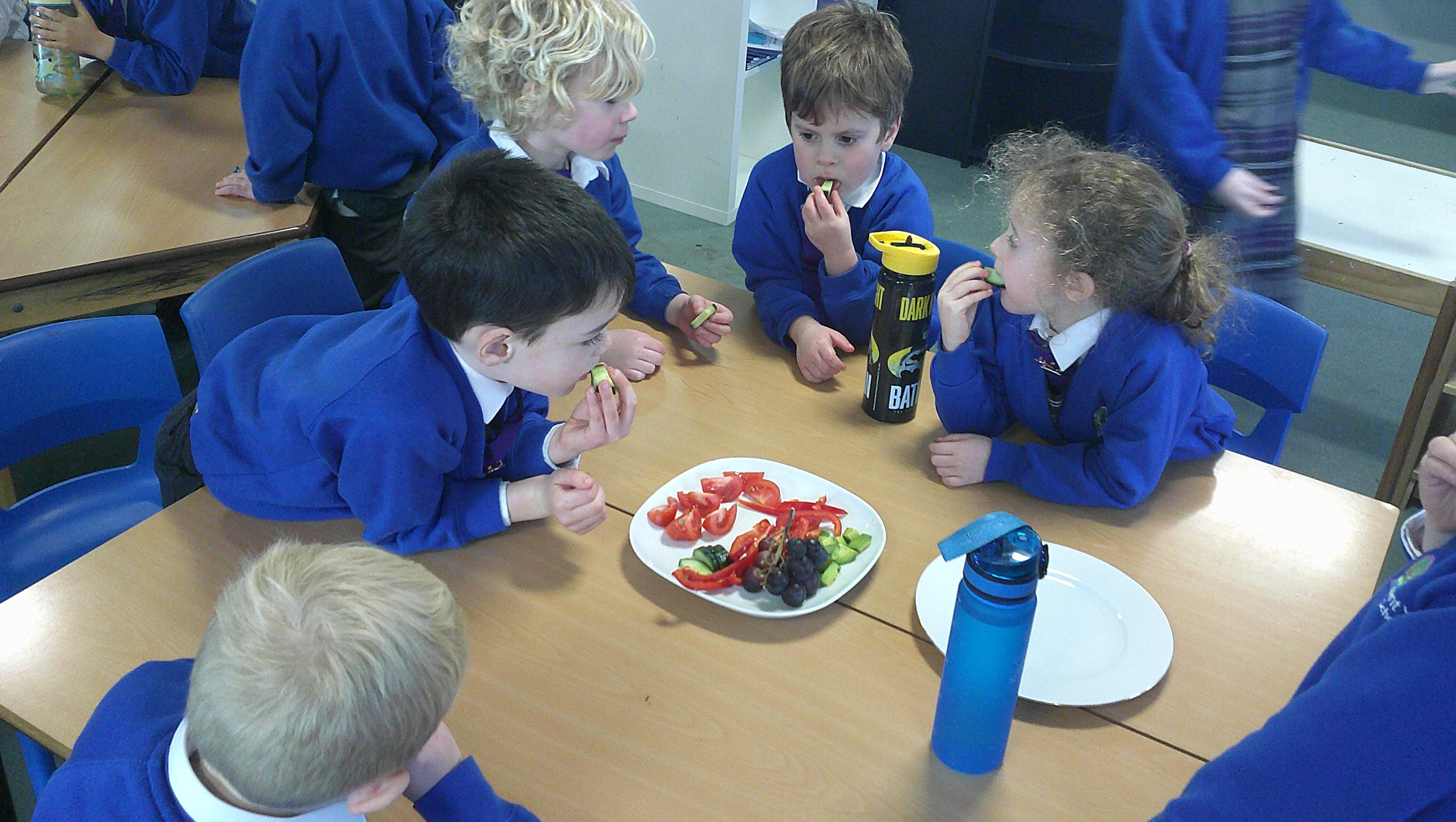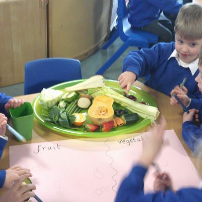 We started our DT food and nutrition unit by exploring fruit and vegetables. We started by naming and describing a wide range of fruit and vegetables. The children gave suggestions as to how we could sort the fruit and vegetables. We then used our knowledge that fruits contains the seed, so we had a careful look to see if we could see the seeds. We finished the session with a food tasting and tasted the fruits that often get mistaken for vegetables (peppers, avocado, cucumber and tomato).