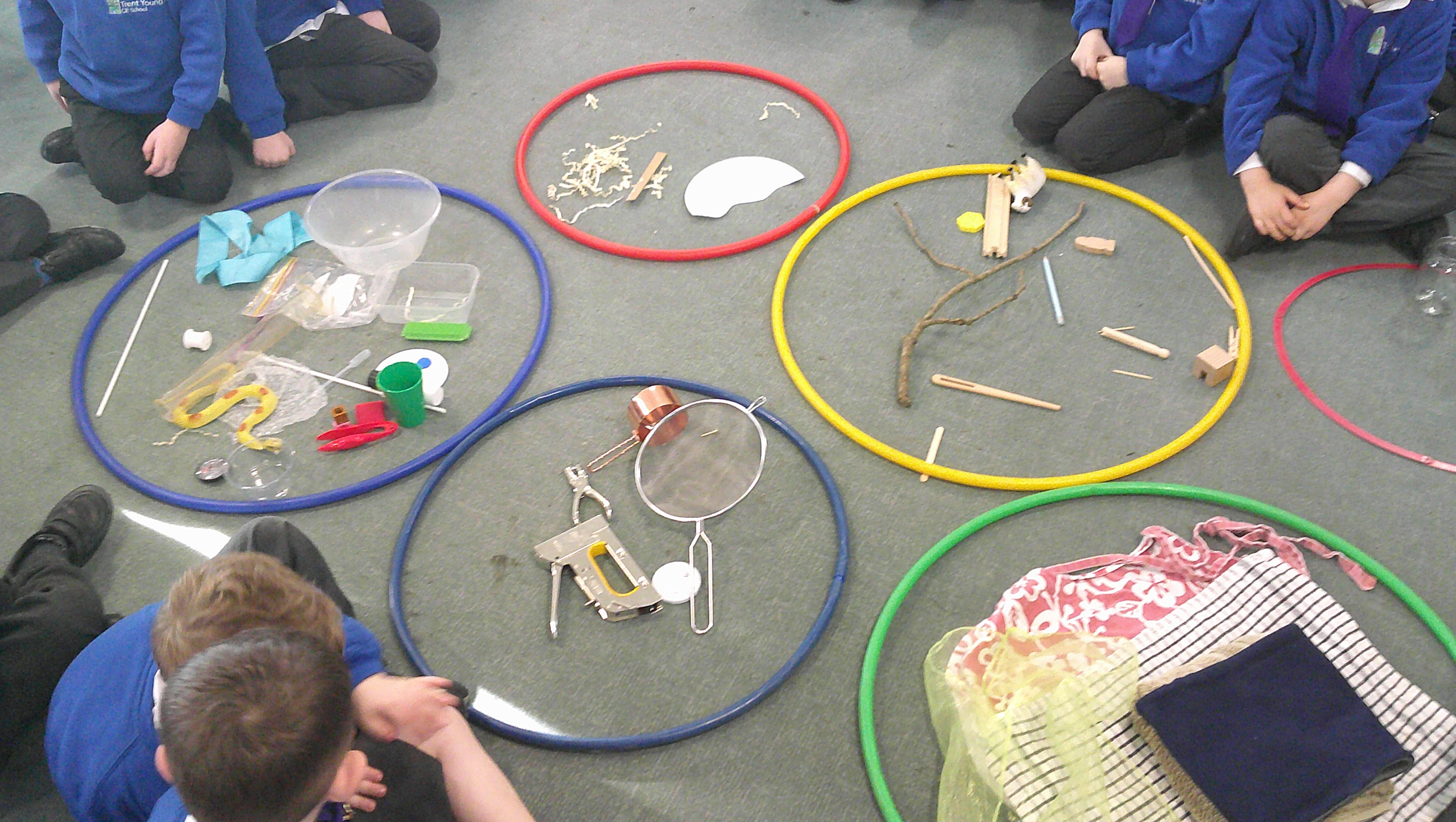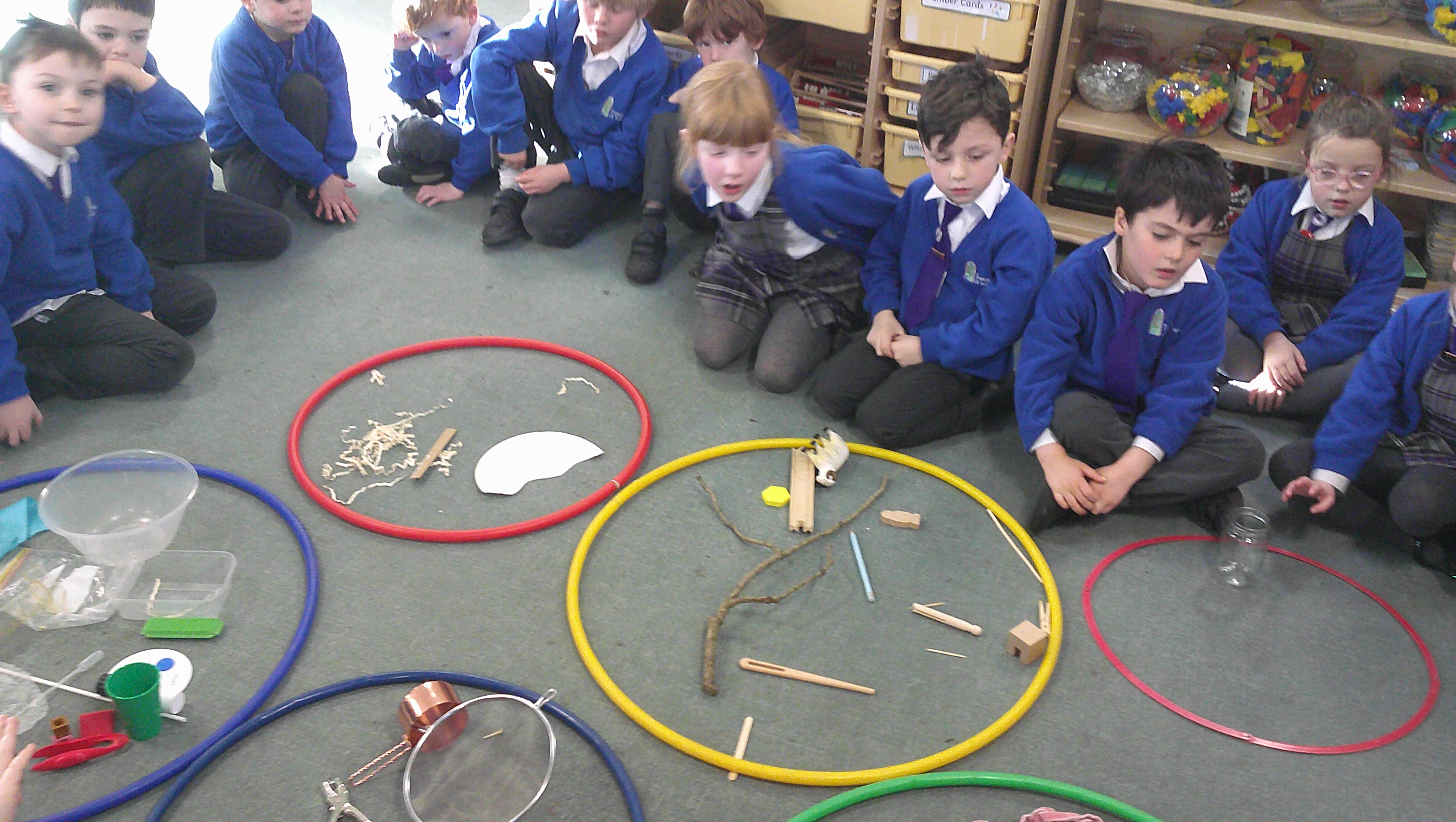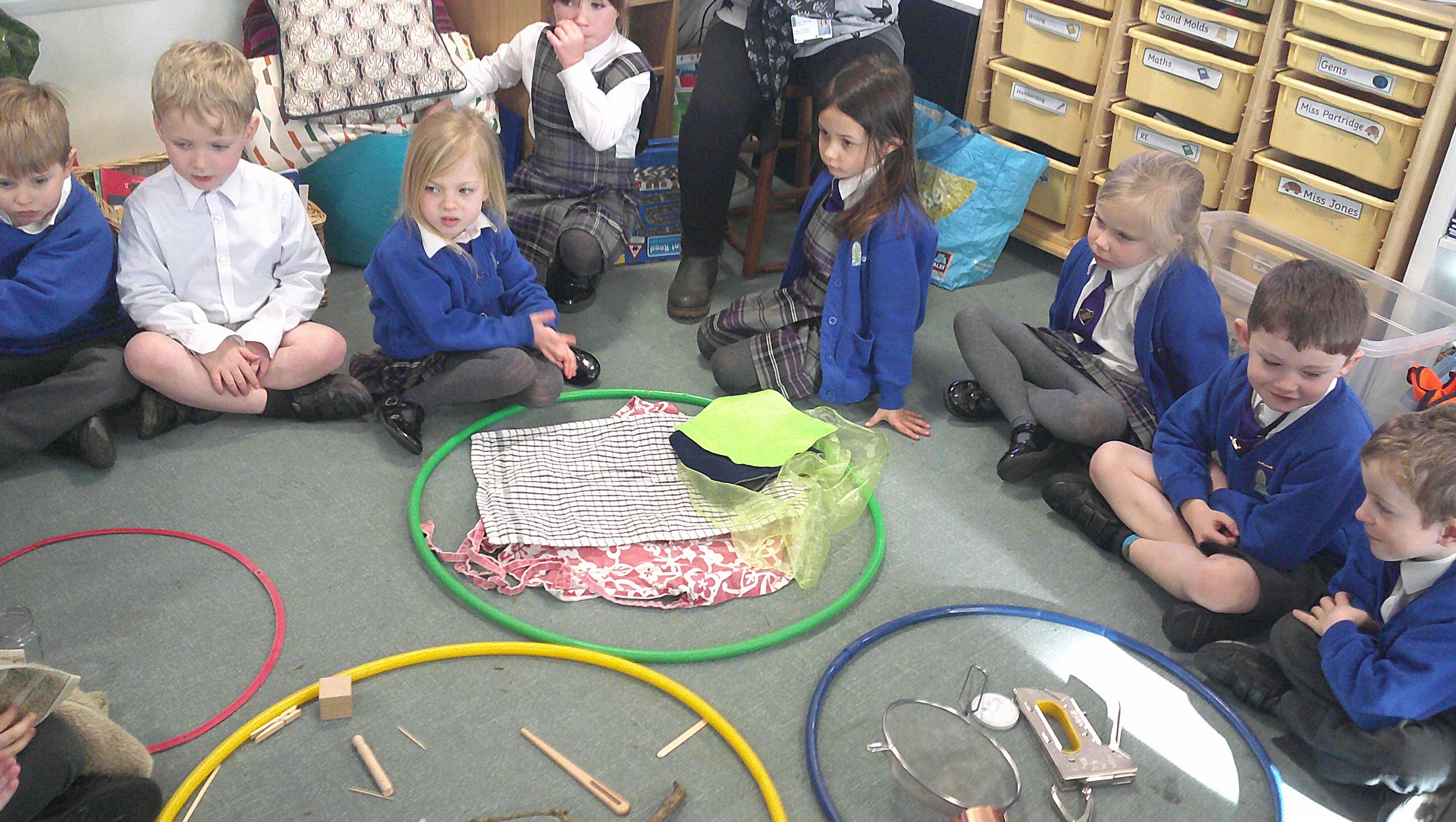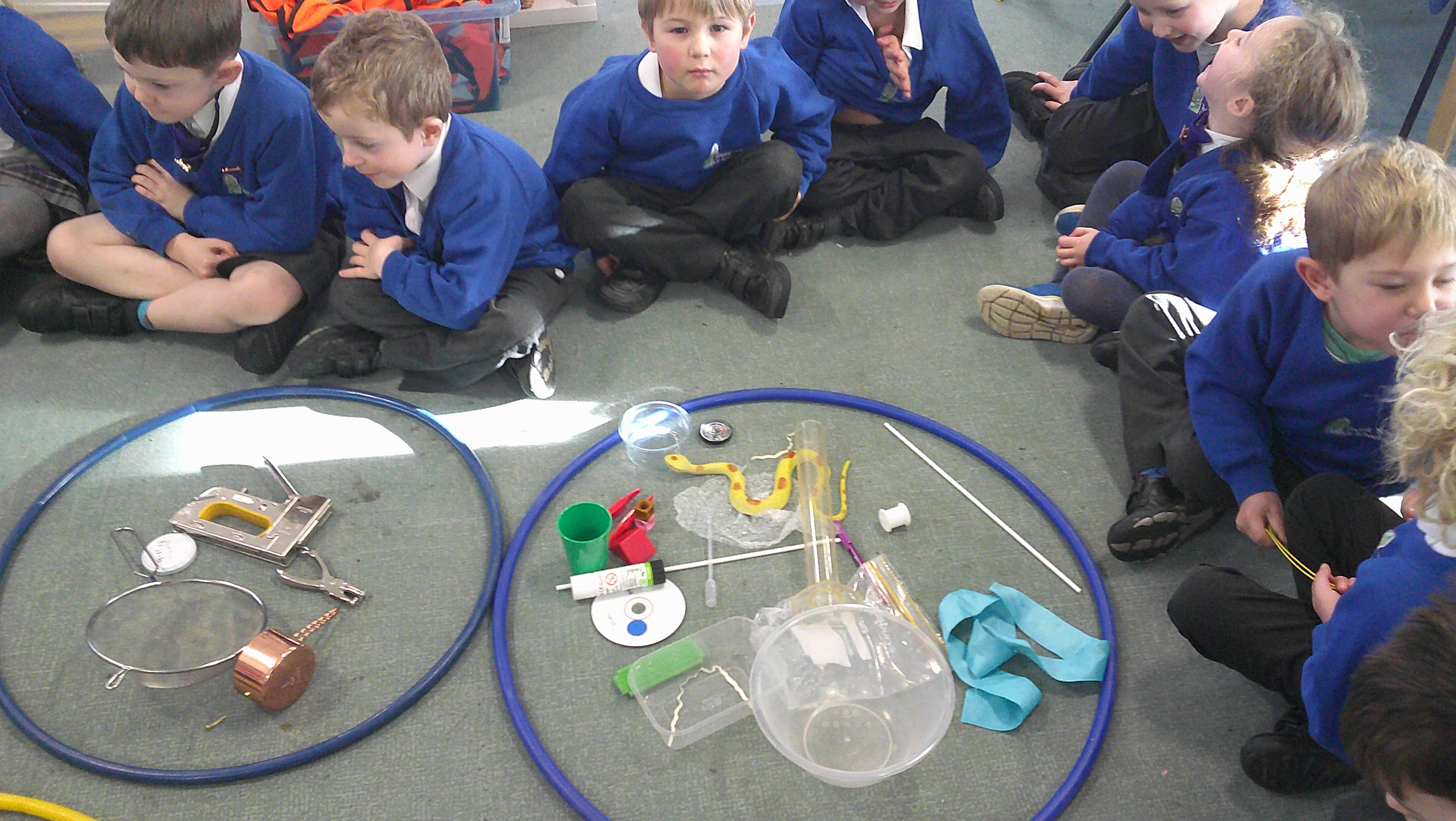In our science learning this week, we sorted different materials into groups. We started to talk about different materials and what they are used for. Here you can see how we sorted the different materials into wood, glass, metal, fabric, paper and plastic.