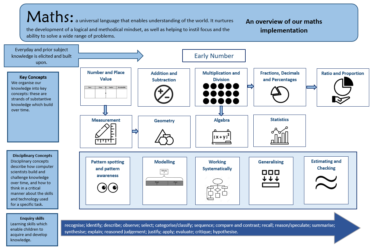 We use resources from White Rose Maths as a vehicle to structure the declarative (I know that), procedural (I know how) and conditional (I know when) knowledge that underpins our maths teaching. We feel that this gives teachers enough guidance to ensure a mastery approach is followed whilst still giving teachers enough autonomy to meet the needs of their class. Across all year groups, progression across and within year groups are mapped through our progression of skills document with objectives mapped out into each half-termly planning grids to ensure that appropriate coverage is achieved over the academic year. These are mapped using the NCETM progression grids and Ready to Progress documents as a guide.