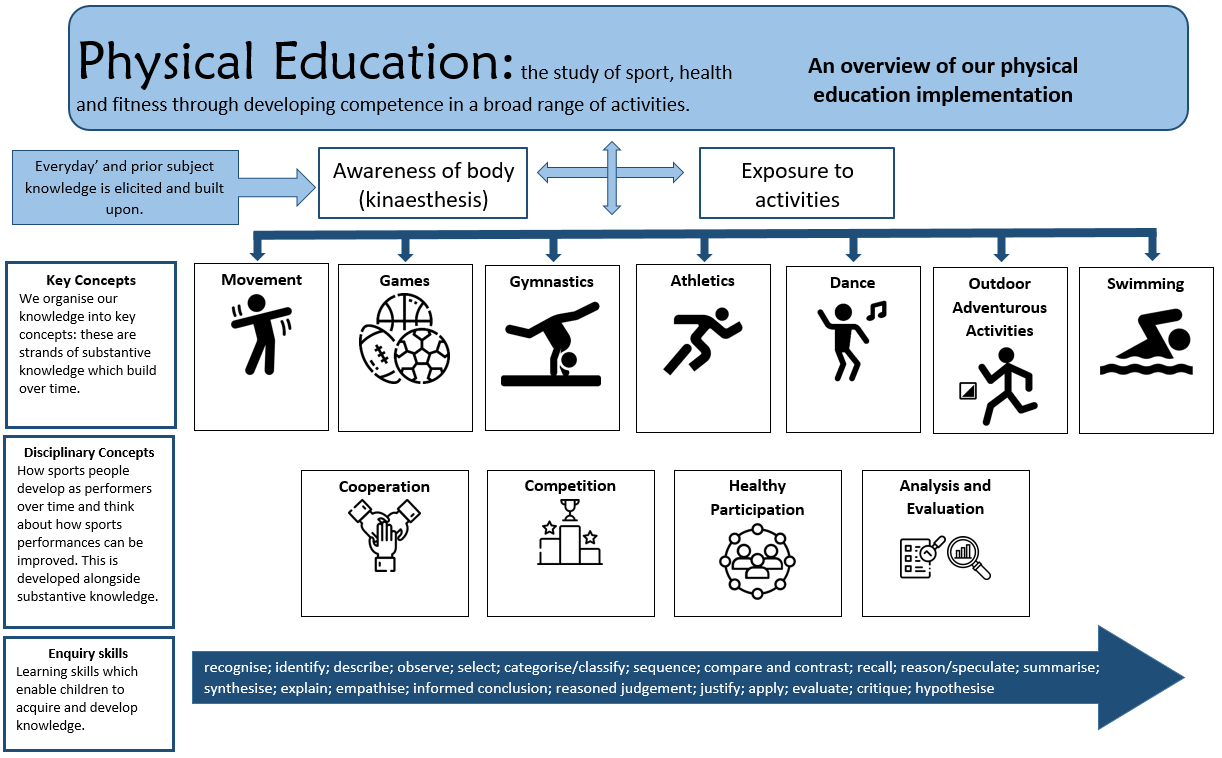 • We organise our knowledge into key concepts: these are strands of substantive knowledge, which build over time. Alongside substantive knowledge, we teach disciplinary concepts (how physical education knowledge is built).